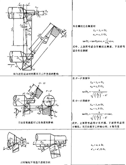 刀具工作角度是刀具在工作參考系中定義的一組角度。在切削過程中,由于刀具安裝位置和進(jìn)給云頂?shù)挠绊,使刀具在工作角度(即刀具的?shí)際切削角度)不同于其在靜止參考系中的角度。表2-4列出了各種不同影響因素下,車到工作角度的修正計(jì)算。