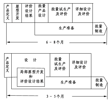 產(chǎn)品開發(fā)是一個從市場獲得需求信息,據(jù)此構(gòu)思產(chǎn)品開發(fā)方案,最終形成產(chǎn)品投放市場的過程。雖然在產(chǎn)品開發(fā)過程中并非所有步驟都可以平行進行,但根據(jù)對產(chǎn)品開發(fā)過程的信息流分析,可以通過一些工作步聚的平行交叉,大大縮短產(chǎn)品開發(fā)時間。例如:日本NEC公司將某種產(chǎn)品原本歷時6--8個月的開發(fā)過程,通過并行重組縮短為3個半月,如圖1。