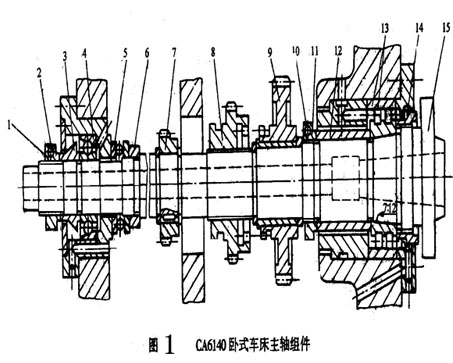 CA6140型臥式車床的主軸是一個(gè)空心階梯軸,其內(nèi)孔用于通過(guò)梆料或穿入鋼棒卸下頂尖,或通過(guò)氣動(dòng)、液壓或電氣夾緊裝置的管道 、導(dǎo)經(jīng)。主軸前端的莫氏6號(hào)錐孔用于安裝前項(xiàng)尖或心軸,利用錐面配合的摩擦力直接帶動(dòng)頂尖或心軸轉(zhuǎn)動(dòng)。