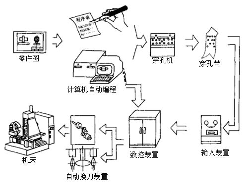 (2) 數(shù)控機(jī)床的工作原理。數(shù)控機(jī)床和加工中心的工作原理見圖7-2,根據(jù)零件圖樣,制訂工藝方案,編制零件的加工程序,把零件所需的機(jī)床各種動(dòng)作及全部工藝參數(shù)變成機(jī)床數(shù)控裝置能接受的信息代碼。并把這些代碼存儲(chǔ)在信息載已上(穿孔帶、磁盤等),將信息載體送到輸入裝置,讀出信息并送入數(shù)控裝置。另一種方法是利用計(jì)算機(jī)和加工中心的接口直接進(jìn)行通信輸入。