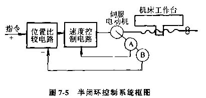 3)半閉環(huán)控制數(shù)控機(jī)床,這種控制方式對(duì)工作臺(tái)的實(shí)際位置不進(jìn)行檢查測(cè)量,而是通過與伺服電動(dòng)機(jī)有聯(lián)系的測(cè)量元件,如測(cè)速發(fā)電機(jī)A和光電編碼盤B(或旋轉(zhuǎn)變壓器)等間接檢測(cè)出伺服電動(dòng)機(jī)的轉(zhuǎn)角,推算出工作臺(tái)的實(shí)際位移梁,并與指令值進(jìn)行比較,用差值來(lái)實(shí)現(xiàn)控制(圖7-5)。這種控制方式工作臺(tái)沒有完全包括在控制回路內(nèi),精度沒有閉環(huán)高,調(diào)試卻比閉環(huán)方便。