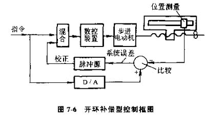 4)開換補(bǔ)償型數(shù)控機(jī)床,將上述三種控制方式的特點(diǎn)有選擇地集中起來(lái),可以組成混合控制的方案。大型數(shù)控機(jī)床,需要高得多的進(jìn)給速度和返回速度,又需要相當(dāng)高的精度。如果只采用全封閉的控制,機(jī)床傳動(dòng)鏈和工作臺(tái)全部置于控制環(huán)節(jié)中,安裝調(diào)試十分復(fù)雜,為了避免這些矛盾,可以采用混合控制方式。圖7-6為開環(huán)補(bǔ)償方式的組成框圖。它的特點(diǎn)是:基本控制選用步進(jìn)電動(dòng)機(jī)的開環(huán)控制伺服機(jī)構(gòu),附加一個(gè)校正伺服電路。通過裝在工作臺(tái)上的直線位移測(cè)量元件的反饋信號(hào)來(lái)校正機(jī)械系統(tǒng)的誤差