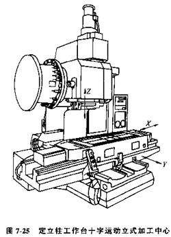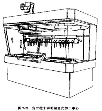 1) 十字工作臺(tái)型(圖7-25)布局與單柱立式坐標(biāo)鏜床或十字工作臺(tái)型數(shù)控立式鉆床類似,適應(yīng)于高度尺寸較小的蓋板類零件多工序加工。