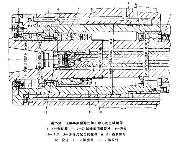 圖7-33所示為THK4680型臥式加工中心的主軸組件,其前軸承為圓錐孔雙列圓柱滾子軸承B3182120和雙向推力角接觸球軸承C2268120,后軸承為C3182118。這些軸承均經(jīng)預緊,B3182120靠修磨調(diào)整圈1.C2268120靠修磨隔套3來調(diào)整預緊量,由帶導向配合的螺母5.鎖緊螺母6.壓緊;后軸承靠修磨調(diào)整圈8調(diào)整預緊量,由鎖緊螺母9壓緊。主軸套筒11與主軸箱體孔由配作保證精密配合,這種高精度、高剛度的主軸組件,其錐孔軸線的徑向圓跳動在0.003mm以內(nèi)(主軸端部)。