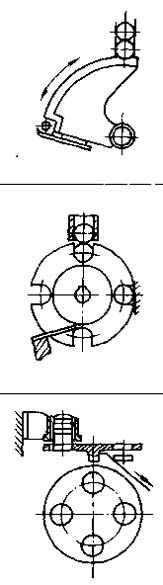 帶溝槽的擺桿往復(fù)擺動(dòng),在上料的同時(shí)兼作零件的隔離。擺桿運(yùn)動(dòng)到工作工位時(shí),其上面的平面封住料槽,從工作工位退回時(shí),零件落入擺桿上的溝槽 |