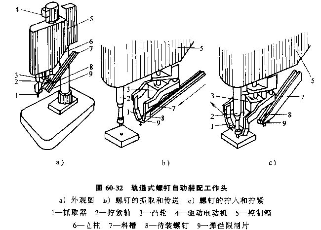 2)軌道式螺紋自動裝配工作頭,這種工作頭的待裝螺釘在軌道中運動。圖60-32為一種能實現螺釘自動傳送、抓取、對準、擰入和擰緊等一系列作業(yè)的工作頭。工作頭的工作過程為: