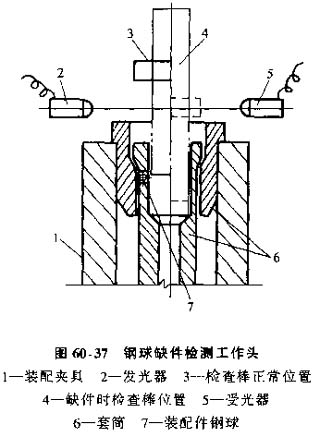 鋼球缺件檢測工作頭,圖60-37所示工作頭應用光電檢測鋼球缺件,圖中檢測棒前端的直徑要比裝入的三個均布鋼球的內(nèi)接圓直徑略大。裝配正常時,檢測棒不能通過;當缺少一個鋼球時則可通過。用光電檢測棒所在的軸向位置,即可判斷是否缺件。