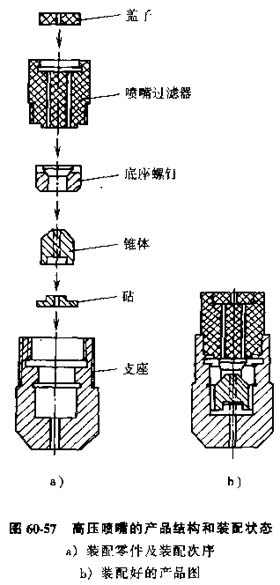 1)產品結構與裝配狀態(tài),裝配圖樣可以提供產品的全貌。如圖60-57所示的高壓噴嘴,圖中各零件都可以逐件沿中心線裝配,因此整個裝配過程可以在一個隨行夾具上完成。不需要預裝配操作。