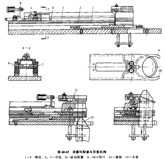 A. 在活塞槽中安裝活塞環(huán)的機(jī)構(gòu),圖60-65機(jī)構(gòu)做成盒子形狀,盒子的壁由滑塊1、2、3、4、5形成,每一個(gè)滑塊帶一套活塞環(huán)中、的一個(gè);瑝K依次安排在導(dǎo)軌6和7上。導(dǎo)軌具有斜角,可將活塞環(huán)壓在安裝基準(zhǔn)中,在起始位置上,這個(gè)些滑塊的端部構(gòu)成了一個(gè)朝向工作區(qū)的臺階,除最底下的一個(gè)滑塊外,每一個(gè)滑塊都有一塊擋鐵,作為推桿來推動其下面的滑塊;上面的滑塊4與往復(fù)運(yùn)動驅(qū)動裝置8相連。滑塊的端部作成兩鉗口9和10,相互之間為彈性聯(lián)系。在導(dǎo)軌6和7上,滑塊按活塞環(huán)的給定高度配置。從專用的盒狀料倉中通過導(dǎo)軌的縫隙拉出活塞環(huán)。當(dāng)滑塊5運(yùn)動時(shí),由于位于滑塊4槽上的擋鐵帶動滑塊4,類似地使滑塊3等移動。每一滑塊確定的間隙在自己的導(dǎo)軌上移動。接著又沿導(dǎo)軌的斜面移動,滑塊一個(gè)個(gè)地堆積起來。此時(shí),每個(gè)活塞環(huán)以自己的大部分端面支撐在踝塊張開的爪上,并被上面滑塊壓住。