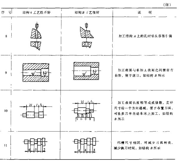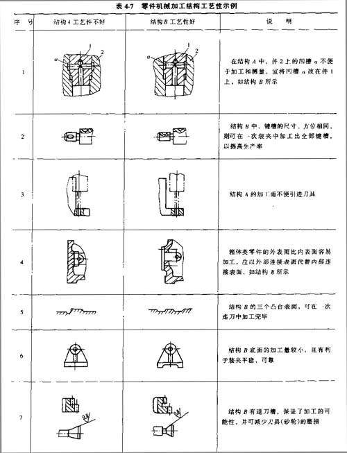 表4-7 列舉了零件機(jī)械加工結(jié)構(gòu)工藝性對比的一些典型實(shí)例,可供分析零件結(jié)構(gòu)的加工工藝性時(shí)參考。