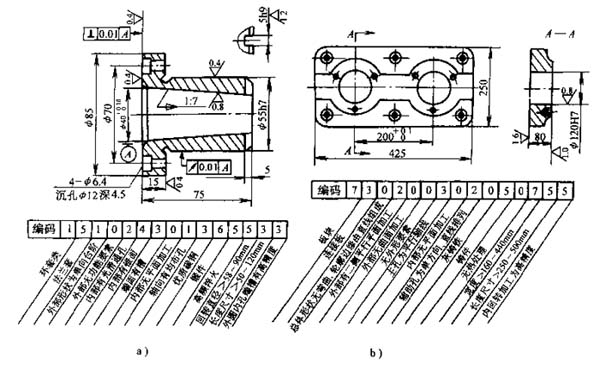 JLBM-1編碼系統(tǒng)由15個(gè)碼位組成(見圖5-3),其中主碼9位,輔碼6位。主碼的第一、第二位為名稱類別矩陣,主要反映零件的功能和主要結(jié)構(gòu),第三至第九位表示零件在形狀與加工方面的各種特征。6位輔碼則分別代表零件的材料、毛坯、熱處理、主要尺寸和精度等有關(guān)信息。每一碼位包括0~9的十個(gè)特征項(xiàng)。JLBM-1為混合式結(jié)構(gòu),名稱類別分回轉(zhuǎn)件和非回轉(zhuǎn)件兩大類,各自成樹狀結(jié)構(gòu),各類的第三至第九位碼分別成鏈?zhǔn)浇Y(jié)構(gòu),輔碼也是鏈?zhǔn)浇Y(jié)構(gòu)。JLBM-1系統(tǒng)的特點(diǎn)是零件類別按名稱類別矩陣劃分,便于設(shè)計(jì)、檢索;分類表簡(jiǎn)單,定義明確,容易掌握;碼位適中,又有足夠的信息容量。圖5-4表示了回轉(zhuǎn)體和非回轉(zhuǎn)體零件用該分類編碼系統(tǒng)進(jìn)行編碼的示例。