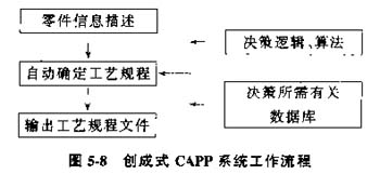 (1)基本原理。創(chuàng)成式CAPP系統(tǒng)的工作原理與派生式不同,在系統(tǒng)中沒(méi)有事先設(shè)定的標(biāo)準(zhǔn)工藝規(guī)程。創(chuàng)成式CAPP系統(tǒng)中儲(chǔ)存的是工藝人員設(shè)計(jì)工藝過(guò)程時(shí)所用的大量工藝數(shù)據(jù)及推理邏輯和決策方法。當(dāng)輸入一個(gè)新零件的有關(guān)信息后,系統(tǒng)可以模擬工藝人員,在沒(méi)有人工干預(yù)的情況下,自動(dòng)地生成零件的工藝過(guò)程。創(chuàng)成式CAPP系統(tǒng)的工作流程如圖5-8所示。