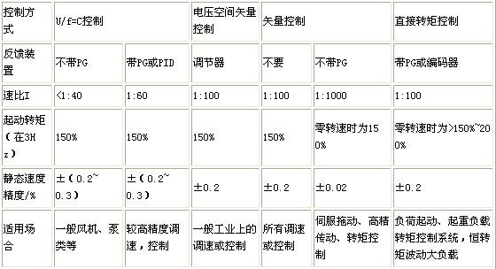 控制方式是決定變頻器使用性能的關(guān)鍵所在。目前市場上低壓通用變頻器品牌很多,包括歐、美、日及國產(chǎn)的共約50多種。選用變頻器時不要認為檔次越高越好,而要按負載的特性,以滿足使用要求為準(zhǔn),以便做到量才使用、經(jīng)濟實惠。表1中所列參數(shù)供選用時參考。