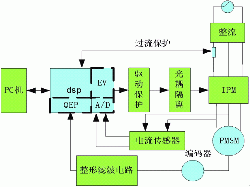 交流伺服數(shù)字化系統(tǒng)的硬件由DSP作為信號處理器,用旋轉(zhuǎn)編碼器和電流傳感器提供反饋信號,智能功率模塊IPM作為逆變器,經(jīng)傳感器出來的信號經(jīng)過濾波整形等處理后反饋給DSP進(jìn)行運算,DSP經(jīng)過對參考信號和反饋信號的處理運算來調(diào)節(jié)伺服系統(tǒng)的電流環(huán),速度環(huán),和位置環(huán)的控制,最后輸出PWM信號經(jīng)過隔離驅(qū)動IPM模塊實現(xiàn)電機的伺服閉環(huán)控制。 系統(tǒng)的硬件結(jié)構(gòu)如圖1所示。