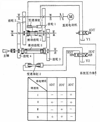 問題出在何處呢?分析圖1可看出,機床在Ⅰ、Ⅲ轉速級是在1DT失電時實現(xiàn)的。如果主軸處于Ⅱ或Ⅳ檔運行狀態(tài),某一外界因素致使電磁鐵1DT突然失電,就會出現(xiàn)下列情況:1DT失電,使閥Y1切換到左位,變換油缸1帶動滑動齒輪1迅速向左移動。而此時位于左端的齒輪2正處于高速運轉狀態(tài),兩齒輪相遇必然會發(fā)生劇烈摩擦撞擊。如果這種情況存在,滑動齒輪1的左端定會受損,上述故障就會發(fā)生。