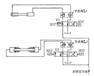 為解決問題,液壓系統(tǒng)從兩方面著手:①換向閥Y1重新選型;②在系統(tǒng)中增加速度調節(jié)環(huán)節(jié)。改造后的原理圖如圖2所示。選用國產(chǎn)24WE6D50/CFG24型電磁換向閥Y3替換Y1。閥Y3帶“記憶”功能,不因電磁鐵失電而改變閥芯位置。在Y3、Y2出油口處增加了節(jié)流閥組L1、L2,使變速油缸1、2獲得理想的運動速度。