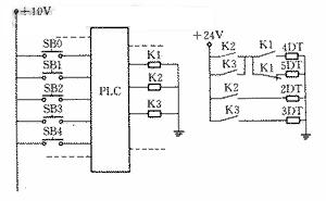 由于閥Y3帶有2個電磁鐵(4DT、5DT),且為“非”關系,如何從已占滿的PLC輸出端點中引出一控制信號來控制5DT呢(圖3)?若增加一輸出端點來控制5DT,勢必要增加輸出模塊,并要修改梯形圖,從而大大增加了改造費用。為此我們對PLC輸出點進行了一些改動(圖4),圓滿地解決了PLC輸出點不足的問題。把PLC原來直接推動電磁鐵改為推動中間繼電器K1、K2、K3,然后由K1、K2、K3來控制電磁鐵4DT、5DT、2DT、3DT。通過K1的常開和常閉點,使4DT和5DT滿足了“非”的關系。