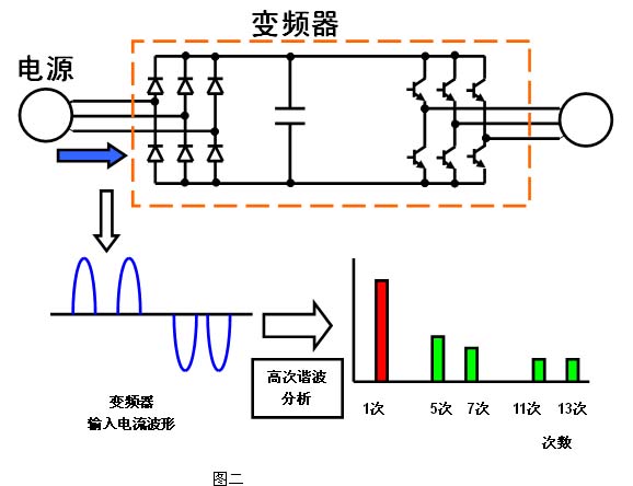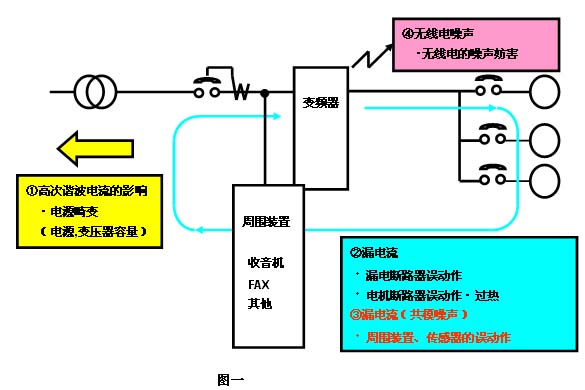 電磁干擾也稱電磁騷擾(EMI),是以外部噪聲和無用信號在接收中所造成的電磁干擾,通常是通過電路傳導(dǎo)和以場的形式傳播的。變頻器的整流橋?qū)﹄娋W(wǎng)來說是非線性負(fù)載,它所產(chǎn)生的諧波會對同一電網(wǎng)的其他電子、電氣設(shè)備產(chǎn)生諧波干擾。如下圖一所示: