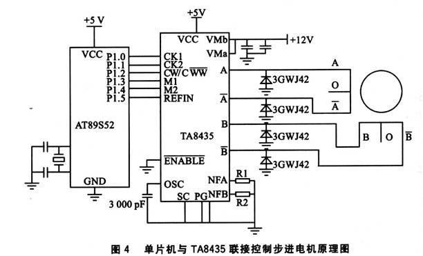 圖4是單片機(jī)與TA8435相連控制步進(jìn)電機(jī)的原理圖。引腳M1和M2決定電機(jī)的轉(zhuǎn)動方式:MI=0、M2=O,電機(jī)按整步方式運(yùn)轉(zhuǎn);Ml=1、M2=0,電機(jī)按半步方式運(yùn)轉(zhuǎn);M1=O、M2=1,電機(jī)按1/4細(xì)分方式運(yùn)轉(zhuǎn);Ml=1、M2=1,電機(jī)按l/8步細(xì)分方式運(yùn)轉(zhuǎn)。CW/CWW控制電機(jī)轉(zhuǎn)動方向,CKl、CK2時鐘輸入的最大頻率不能超過5 kHz?刂茣r鐘的頻率,即可控制電機(jī)轉(zhuǎn)動速率。REFIN為高電平時,NFA和NFB的輸出電壓為0.8 V,REFIN為低電平時,NFA和NFB輸出電壓為0.5 V,這2個引腳控制步進(jìn)電機(jī)輸入電流,電流大小與NF端外接電阻關(guān)系式為:,Io=Vref/Rnf。圖4中,設(shè)REFIN=l,選用步進(jìn)電機(jī)額定電流為0.4 A,Rl、R2選用1.6 Ω、2W的大功率電阻,O、C兩線不接。步進(jìn)電機(jī)按二相雙極性使用,四相按二相使用時可以提高步進(jìn)電機(jī)的輸出轉(zhuǎn)矩。D1~D4快恢復(fù)二極管用來泄放繞組電流。