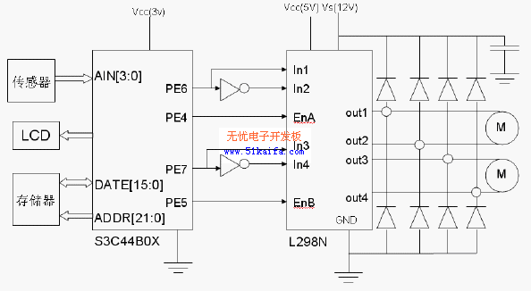 在智能小車的研制開發(fā)中,很重要的一部分就是智能小車要能根據(jù)周圍障礙物的情況自主的調(diào)節(jié)行駛速度和行駛方向。本文中所設(shè)計的直流電機(jī)調(diào)速系統(tǒng)是智能小車的一個重要組成部分,直流電機(jī)調(diào)速系統(tǒng)主要由S3C44B0X處理器和電機(jī)驅(qū)動芯片L298N構(gòu)成,主要功能是驅(qū)動小車的兩個車輪,調(diào)節(jié)小車的行駛速,通過改變兩個車輪的轉(zhuǎn)速差調(diào)節(jié)行駛方向。