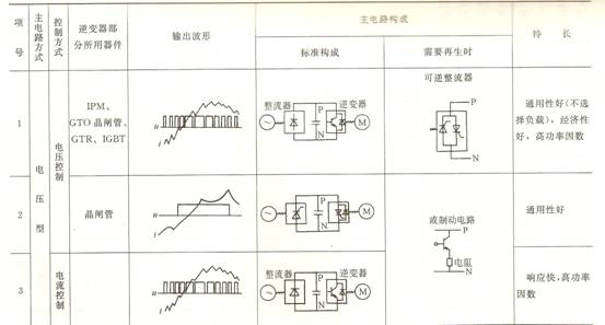1.電壓控制 通用變頻器適用電壓型的電壓控制。表1中項1IGBT變頻器和GTO晶閘管變頻器,是在逆變器側(cè)控制輸出的電壓和頻率。輸出電壓的大小,可以利用半導(dǎo)體開關(guān)的導(dǎo)通率將輸出電壓控制成為正弦波。表1中項2及4的晶閘管變頻器,是在整流器側(cè)控制輸出電壓,在逆變器側(cè)控制頻率。