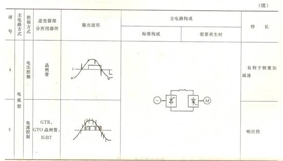 表1中項5的電流型晶閘管變頻器,在逆變器側(cè)控制頻率,在整流器側(cè)控制電流。該表中項3,用晶體管和GTO晶閘管構(gòu)成的電壓型變頻器則適用這樣的電流控制方式,利用逆變器側(cè)的導(dǎo)通率將輸出電流控制成為正弦波。