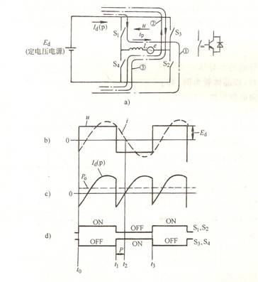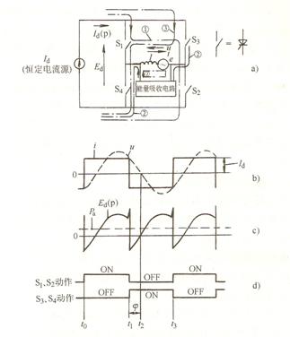現(xiàn)在,使開關(guān)S1、S2導(dǎo)通,由直流電壓源Ed沿圖a中①路線供給負(fù)載電流i。在時刻t1使這兩個開關(guān)關(guān)斷,同時使開關(guān)S3、S4導(dǎo)通,于是負(fù)載的無功功率就沿②路線反饋給直流電壓源Ed。