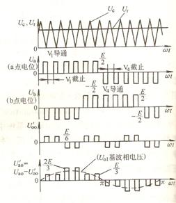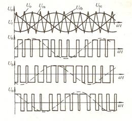 2.雙極性調(diào)制 上述單極性脈寬調(diào)制,脈沖的極性不改變,要正、負(fù)半周輸出不同極性的脈沖,必須另加倒相電路。與此相對應(yīng),若在調(diào)制過程中,載頻信號和參考信號的極性交替地不斷改變則稱為雙極性調(diào)制。其調(diào)制波形如圖10所示,圖中畫出三相調(diào)制波形。與上述單極性SPWM的情況相同,輸出電壓的大小和頻率也是由改變正弦參考信號Ur的幅值大小和頻率調(diào)制的。參考信號也可以采用階梯式準(zhǔn)正弦波。