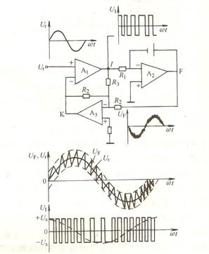 “Δ”脈寬調(diào)制電路的基本工作原理:正弦波參考信號電壓Ur加在運(yùn)算放大器A1的同相輸入端,A1作為比較器工作。當(dāng)Ur從零上升時,A1的輸出電壓U1迅速升到正飽和值Us,+Us電壓經(jīng)運(yùn)算放大器A2作反向積分,其輸出電壓UF負(fù)向線性增長,UF和+U1經(jīng)R2、R3綜合加到運(yùn)算放大器A3的反相輸入端,R3>R2,A3輸出正向上升電壓UK,UK與Ur在運(yùn)算放大器A1中相比較,當(dāng)UK< SPAN>r時,A1輸出保持+Us,一旦UK上升到UK>Ur時,A1迅速翻轉(zhuǎn)輸出負(fù)飽和電壓-Us。-Us電壓再經(jīng)運(yùn)算放大器A2反向積分,使其輸出UF負(fù)值線性減小,從而使A3的輸出電壓UK也隨之減小,當(dāng)UK< SPAN>r時,U1又轉(zhuǎn)換為+Us,UF負(fù)值又增大,UK再次上升,如此循環(huán)不已,便得到圖11所示的“Δ”脈寬調(diào)制波形。