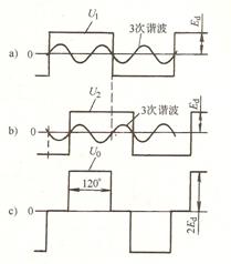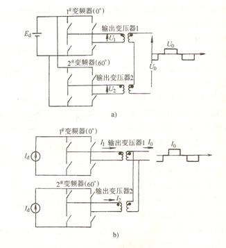 圖12為多重化變頻器的原理。將單相變頻器的電壓波形(或電流波形)按傅立葉級數(shù)展開,則含有不少高次諧波。并在圖中給出了3次諧波。