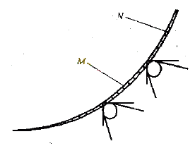 誤差分析在數(shù)控車床使用過程中,為了降低被加工工件表面的粗糙度,減緩刀具磨損,提高刀具壽命,通常將車刀刀尖刃磨成圓弧,圓弧半徑一般在0.4~1.6mm之間。如圖1所示,采用試切法對刀時由A、B兩點(diǎn)分別確定刀架中心的X、Z位置。這樣,加工程序所描述的刀位點(diǎn)是P點(diǎn),數(shù)控系統(tǒng)將控制P點(diǎn)的運(yùn)動軌跡,而在切削時實(shí)際起作用的切削刃則是刀尖圓弧上的各切點(diǎn),這勢必會產(chǎn)生加工表面的形狀誤差。在車削外圓、內(nèi)孔及端面時,這個誤差為零。而在加工弧面和錐面時,這個誤差就很明顯。圖1零件SR10-0.04球面加工的誤差分析見圖2。圖中M線為加工程序所描述的P 的軌跡,即工件的理想尺寸,而實(shí)際加工后的輪廓是N線,陰影就是少切削部分,即加工誤差。假設(shè)刀尖圓弧半徑為r=0.4mm,理論分析表明,N線是半徑為R-r=9.6的圓弧,M、N兩圓弧圓心X、Z向均相距r=0.4mm,最大誤差約為0.17mm,不滿足精度要求。