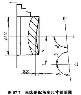 圖57-7為車床精度標(biāo)準(zhǔn)中精車端面的平面度要求,在300mm直徑上,只允許凹入0.02mm,在圖中以ao表示。ao在裝配工作中靠主軸軸線Ⅰ與床身V形導(dǎo)軌Ⅱ在水面內(nèi)的平行度a1和橫向滑板上燕尾導(dǎo)軌Ⅲ對床身V形導(dǎo)軌Ⅱ的垂直度a2來保證。若規(guī)定a1=0~0.015/300,即只允許主軸前端向前偏,待確定a2的尺寸及偏差。