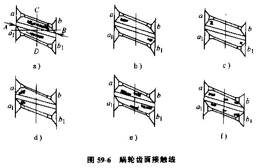 圖59-6a為正常接觸,圖中AB和CD分別表示軸線和中央截面,兩個(gè)箭頭所指處分別表示 ab、a1b1兩齒面的嚙入口,根據(jù)運(yùn)動(dòng)精度分析,接觸斑點(diǎn)最好分布在中央截面附近,略偏于嚙入口一端,根據(jù)潤(rùn)滑條件分析,接觸斑點(diǎn)略偏于嚙出口一端有利于建立油膜。