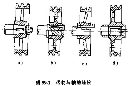 帶輪孔與軸一般采用過渡配合(H7/K6),有少量過盈,對同軸度要求較高。為了傳遞較大的轉(zhuǎn)矩,需用鍵和緊固件進(jìn)行周向,軸向固定,圖59-1所示為帶輪在軸上的集中固定方式。