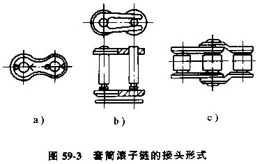 套筒滾字鏈的接頭形式見圖59-3所示。圖59a為用開口銷固定活動銷軸,圖59-3b為用彈簧卡片固定活動銷軸,這兩種方法都用于鏈條節(jié)數(shù)為偶數(shù)。用彈簧卡片時要注意使開口端方向與鏈條的速度方向像反,以防在運轉中脫落。圖59-3c為采用過渡鏈節(jié)結合,用于鏈條節(jié)數(shù)為奇數(shù)。