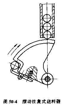 b.?dāng)[動(dòng)式送料器,圖50-4是帶動(dòng)式送料器,其搖臂上面為工件止動(dòng)面,兼有隔料作用。擺臂運(yùn)動(dòng)可由氣壓、液壓、機(jī)械傳動(dòng)。擺動(dòng)式送料器結(jié)構(gòu)比直線簡單,不需較長的滑動(dòng)導(dǎo)軌,節(jié)省空間,送料速度快。