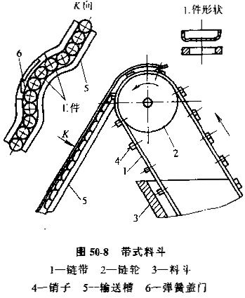 抓取法定向利用運(yùn)動(dòng)的定向機(jī)構(gòu)抓取工件的某些表面,。如孔、凹槽等,使之從成堆的雜亂工件中分離出來,并定向排列。圖50-8所示的帶式料斗,適用于碗狀、蓋狀和環(huán)狀零件的自動(dòng)定向。裝有銷4的鏈帶1在連續(xù)運(yùn)動(dòng)時(shí),堆在料斗3中的工件被銷子4掛住,依次送入輸送槽5,當(dāng)槽5中料滿時(shí),銷子1仍帶工件擠入槽5,槽上彎曲部分的彈簧蓋門6被打開,多余的工件落入外料箱。