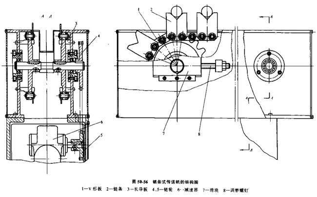 如圖50-56所式,它由兩列封閉式鏈條、鏈輪和驅(qū)動(dòng)裝置所組成。用于支承工件及定位的V形板1,等距地固定在鏈條2的削軸上,隨同鏈條一起運(yùn)動(dòng)。鏈條由電動(dòng)機(jī)通過(guò)減速器6和鏈輪5、4傳動(dòng),為了防止鏈條下垂,每個(gè)環(huán)節(jié)側(cè)面的滾子支承在導(dǎo)板3上,在減速器軸端裝有電磁離合器。用來(lái)實(shí)現(xiàn)鏈條的準(zhǔn)確停止。鏈條的松緊可以通過(guò)螺釘8和滑塊7調(diào)節(jié)。