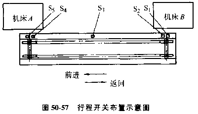 為了控制不同的工作過(guò)程,在料道上裝有五個(gè)行程開(kāi)關(guān),由工件在行程開(kāi)關(guān)上發(fā)出信號(hào),見(jiàn)圖50-57。其控制過(guò)程為: