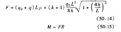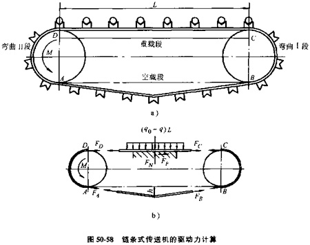鏈條式傳誦機(jī)的驅(qū)動(dòng)力F和驅(qū)動(dòng)力距M,可參照鏈條運(yùn)輸機(jī)的受力分析方法計(jì)算,見(jiàn)圖50-58。