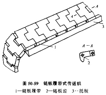 鏈板履帶式傳送機(jī)是采用一節(jié)節(jié)帶齒的鏈板組成的,鏈板表面磨光,靠摩擦力傳送工件,見(jiàn)圖50-59。