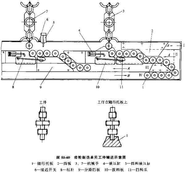 圖50-60是由鏈板履帶傳送機(jī)組成的齒輪加工單元,工件安裝在隨行托板中,在鏈板履帶上輸送,箭頭A表示工件傳送方向,工件從通道Ⅰ輸入,經(jīng)分路擋板2分成兩路。一路沿通道Ⅱ進(jìn)入第一臺(tái)滾齒機(jī)貯料區(qū),另一路沿通道Ⅲ經(jīng)分路擋板9進(jìn)入第二臺(tái)滾齒機(jī)貯料區(qū)。上料時(shí),液壓缸4動(dòng)作,通過(guò)杠桿機(jī)構(gòu)8使撥料板10及擋料爪11動(dòng)作,撥料塊將工件撥至機(jī)械手3前,擋料爪則將通道Ⅱ繼續(xù)送來(lái)的工件擋住,加工好的工件由通道Ⅰ輸出。