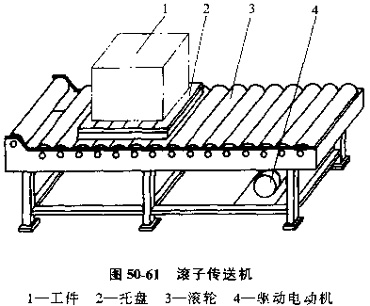 滾子傳送機(jī)是由一根根平行的轉(zhuǎn)軸。及轉(zhuǎn)軸上套的滾輪,鏈輪(或齒輪)及驅(qū)動(dòng)裝置組成的。見(jiàn)圖50-61/滾輪安裝成等高,靠滾動(dòng)摩擦力傳送工件。