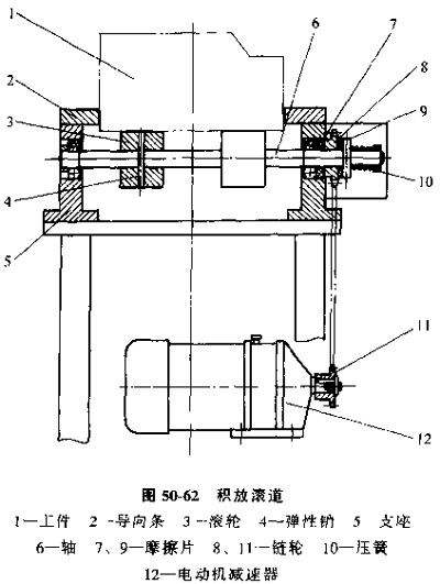 當(dāng)轉(zhuǎn)軸與鏈輪、滾輪均采用剛性聯(lián)接時(shí),傳送機(jī)屬于強(qiáng)制滾輪,即不論工件處于什么狀態(tài),在電動(dòng)機(jī)運(yùn)轉(zhuǎn)情況下,滾輪始終勻速轉(zhuǎn)動(dòng),此時(shí)如果工件被擋料器阻擋停下,滾輪與工件輸送面之間的滾動(dòng)摩擦變?yōu)榛瑒?dòng)摩擦,會(huì)加大輸送面的磨損,這時(shí)對(duì)一些材質(zhì)較軟。用已精加工面作輸送面,或?qū)斔兔婢纫蟾叩墓ぜ螂S行夾具來(lái)說(shuō)是不利的,因此,現(xiàn)在多采用積放式滾子傳送機(jī),也就是滾輪與轉(zhuǎn)軸之間,或轉(zhuǎn)軸與鏈輪之間,不采用剛性聯(lián)接,而是靠摩擦傳動(dòng),見(jiàn)圖50-62。當(dāng)正常輸送時(shí),驅(qū)動(dòng)力通過(guò)鏈條、鏈輪、滾輪、驅(qū)動(dòng)工件,工件與滾輪間為純滾動(dòng),當(dāng)工件被擋住時(shí),滾輪與轉(zhuǎn)軸或轉(zhuǎn)軸與鏈輪之間的摩擦力小于工件與滾輪間的靜摩擦,工件與滾輪保持靜止,而滾輪與轉(zhuǎn)軸,或轉(zhuǎn)軸與鏈輪之間相對(duì)打滑,從而減少了對(duì)工件輸送面的磨損。采用滾輪與轉(zhuǎn)軸相對(duì)摩擦傳動(dòng)的方式,結(jié)構(gòu)相對(duì)簡(jiǎn)單。但滾輪與轉(zhuǎn)軸間磨損較快,對(duì)輸送精度和維修更換不利。采用鏈輪端面摩擦方式,可以通過(guò)彈簧調(diào)整摩擦力。較少摩擦片磨損的影響。維修更換都比較方便,但軸向尺寸需要加大。