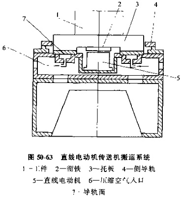 圖50-63是用于組成柔性制造系統(tǒng)的直線電動(dòng)機(jī)傳送機(jī),在這一輸送系統(tǒng)中,托盤(pán)在空氣靜壓導(dǎo)軌上運(yùn)行,直線電動(dòng)機(jī)設(shè)置在中部,銜鐵設(shè)置在托板下方。