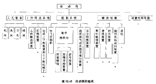 自動(dòng)線由基本工藝設(shè)備、各種輔助設(shè)備以及控制系統(tǒng)等所組成。根據(jù)工件的具體情況、工藝要求、工藝過(guò)程、生產(chǎn)率要求和自動(dòng)化程度等因素,自動(dòng)線的結(jié)構(gòu)及復(fù)雜程度有很大差別,自動(dòng)線的基本組成部分見(jiàn)圖52-43。