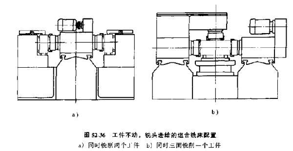 圖52-36所示為采用工件不動(dòng),銑頭進(jìn)給的兩面及三面組合銑床的配置方案。
