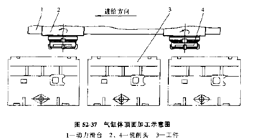 圖52-37為銑削氣缸體頂面的示意圖,動(dòng)力滑臺(tái)1上裝有兩個(gè)臥式銑削頭。銑削頭2用于粗銑,銑削頭4用于精銑。