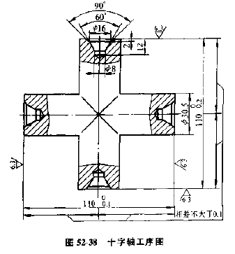 十字軸為鋼件,需要在四個(gè)軸頸上銑端面及鉆中心孔,見圖52-38。