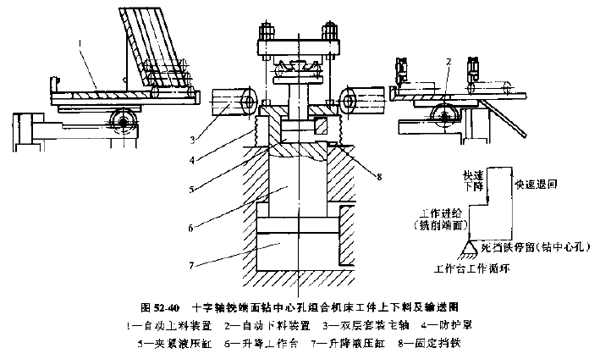 機(jī)床方案分析;由于需要的生產(chǎn)率較高,應(yīng)采用多面組合機(jī)床(見圖52-39),同時(shí)對(duì)四個(gè)軸頸加工,銑端面和鉆中心孔兩道工序可合并在一個(gè)工位上進(jìn)行。工件在輸送過程中停留實(shí)現(xiàn)銑削加工,輸送部件靠死擋鐵停留時(shí),由四面同時(shí)鉆中心孔,根據(jù)這種方案,機(jī)床主軸可以采用雙層套裝的結(jié)構(gòu)形式,外層主軸裝有套形銑刀銑十字軸端面,因主軸裝中心孔鉆頭,并用單獨(dú)的軸向進(jìn)給液壓缸進(jìn)給鉆孔。為了提高機(jī)床自動(dòng)化程度。還設(shè)有自動(dòng)上下料裝置(見圖52-40)。工件裝入傾斜料倉(cāng)內(nèi),由推料托盤送入垂直移動(dòng)的輸送臺(tái)臺(tái)面上。由液壓缸把工件頂起向上夾緊,夾具定位板由兩根支柱支承,定位面朝下,可避免定位面上積屑。工件夾緊后垂直向下快進(jìn),轉(zhuǎn)為工作進(jìn)給后進(jìn)行銑削,靠固定擋鐵停留時(shí)進(jìn)行鉆中心孔,然后快退到原始位置停止,完成全部加工,機(jī)床還設(shè)有自動(dòng)檢查所銑端面距離及中心孔深度上下限尺寸的裝置,并給出合格與否的信號(hào)。合格工件自動(dòng)滑入料箱,實(shí)現(xiàn)加工的全部自動(dòng)化。